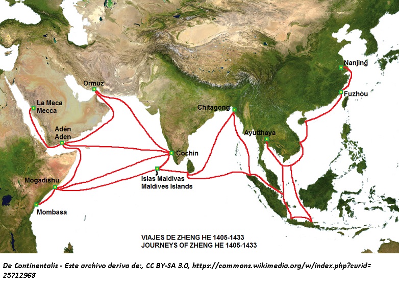 Zheng He, fue el mayor explorador marítimo chino en la historia y el más importante de Asia, desde el 1405 al 1433 lideró 7 grandes expediciones marítimas, fue general, almirante y musulman. Cruzó los océanos y los mares, desde el mar del sur de China hasta la costa este de África, atravesando el Océano índico, el Golfo Pérsico y el Mar Rojo. La figura de Zheng con el aislamiento chino cayó en el olvido, dando ventaja a otros para explorar las rutas marítimas.