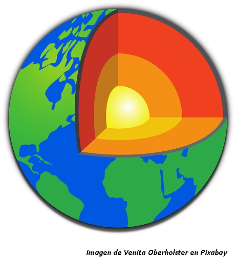 El interior de la Tierra tiene cuatro capas principales: En el exterior está la corteza, compuesta por suelo y rocas conocidas. Bajo ella está el manto, de roca sólida con una capa fundida encima. El interior o núcleo de la Tierra posee dos partes: una capa externa de fluidos y un núcleo interno sólido.