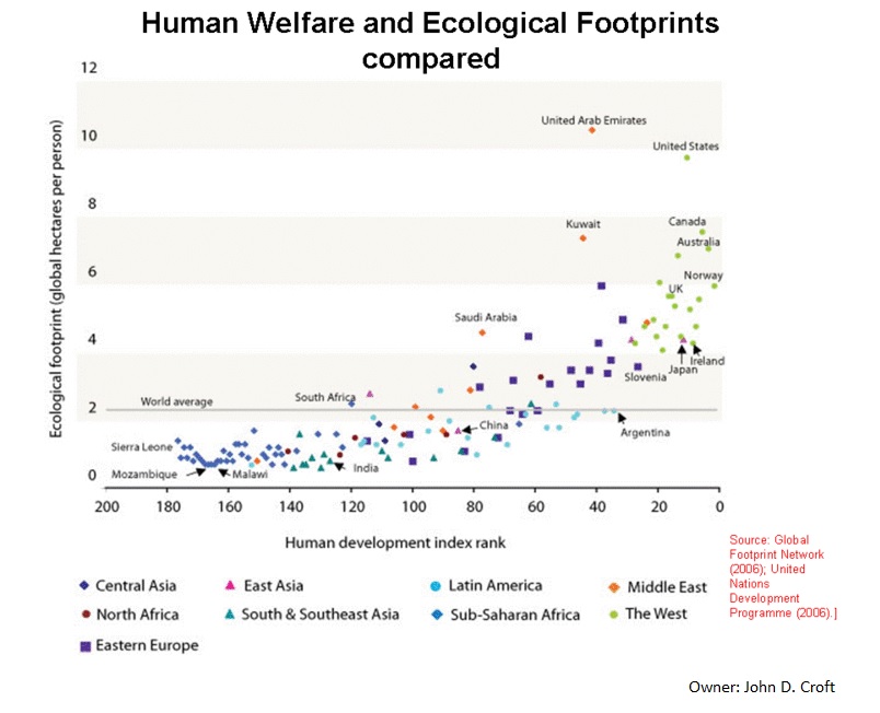 Estamos destruyendo los recursos a una velocidad superior a su ritmo de regeneración natural, según “Global Footprint Network” con datos de 2003 la “huella ecológica” de: Emiratos Árabes Unidos (11,9), Estados Unidos (9,6); Canada (7,6), Australia (6,6), España (5,4), Argentina (2,3), etc…